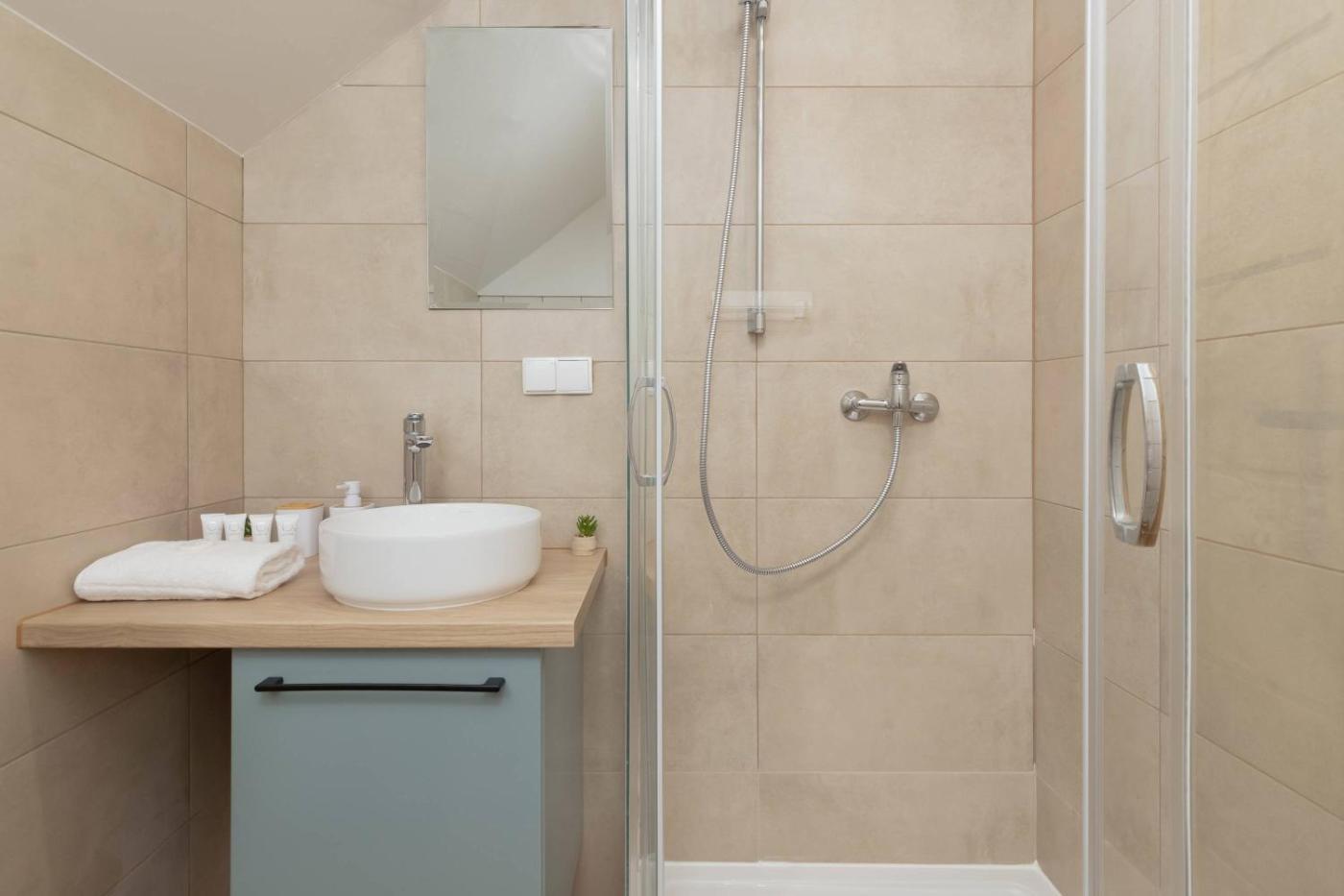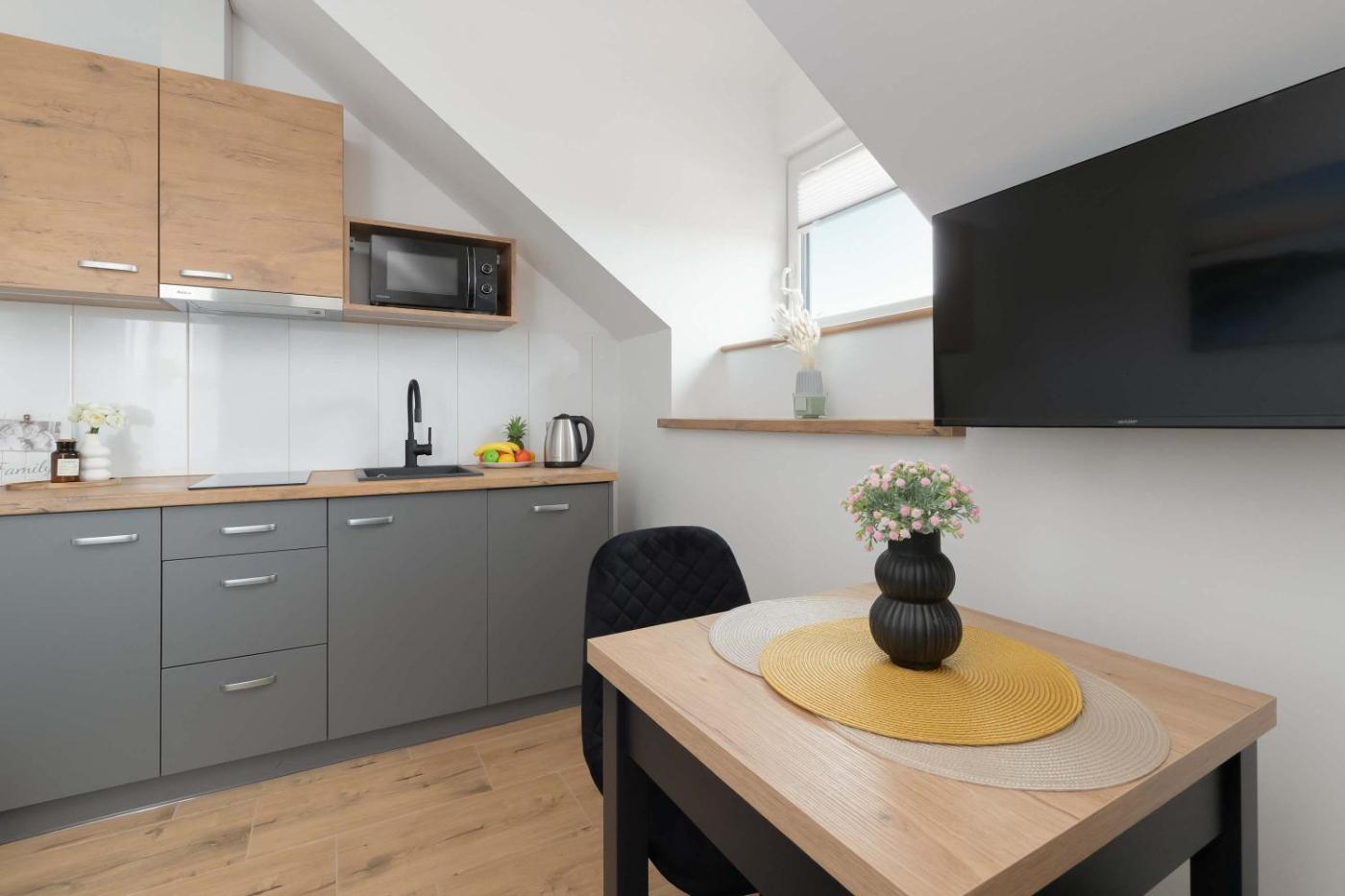 Apartament. Boasting a private entrance, this apartment features 1 living room, 1 separate bedroom and 1 bathroom with a shower and a hairdryer. Guests can make meals in the kitchenette that has a stovetop, a refrigerator, a dishwasher and kitchenware. A seating area with a flat-screen TV, a tea and coffee maker and a balcony are offered in this apartment. The unit has 2 beds. Apartament - 5 osobowy. Powierzchnia pokoju ok.: 31 mkw. ;